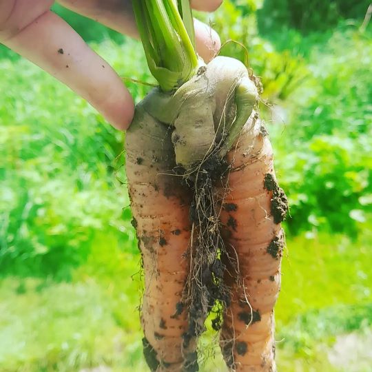 Allotmenting at this time of year is mostly about getting the ground ready for the new sowing season, planning what’s going to go where, and building elaborate systems of raised beds, stick frames, netted cages and so on (my allotmenting partner likes a project). I am rather excited to have some poblano seeds for the first time and will sow them very soon on our heated, windowsill-based modules to ensure the longest growing season possible, whatever the unpredictable UK weather is going to bring us this year. Poblanos, with their shiny, so deeply green they’re almost purple, sheen will almost certainly produce some contenders for Rude Veg of the Year 2024. While we wait for that glorious day, let’s marvel at the joint winners of the title from last year: a salacious pair of Pink Furry Bear tomatoes, who could barely keep their bits off each other in my greenhouse, and a very bushy carrot, which was one of only eight that grew from a full row at the allotment.